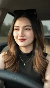 “Potret realistis ultra-detail seorang wanita cantik dengan wajah identik 100% sama persis seperti foto referensi terlampir, tanpa perubahan bentuk wajah sedikit pun. Dia berada di dalam mobil seolah menyetir mobilnya, dengan pencahayaan alami pafi hari yang hangat mengenai wajahnya dari arah samping, menghasilkan efek lembut dan alami. Rambut panjang hitam keemasan bergelombang lembut, berkilau alami di bawah sinar matahari. Kulit halus dengan rona pipi merah muda natural, bibir berwarna merah lembut matte. Mengenakan atasan tanpa lengan hitam elegan dan kalung liontin berbentuk Huruf R berwarna emas. Kacamata hitam diletakkan di atas kepala. Gaya foto close-up realistis dengan kedalaman bidang dangkal (bokeh lembut di latar belakang), pencahayaan natural daylight, resolusi sangat tinggi, warna kulit realistis, tampilan profesional seperti hasil kamera DSLR. Fokus utama pada ekspresi wajah yang tenang dan menawan.”