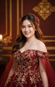 Potret studio ultra realistis wanita muda dengan wajah identik 100% seperti foto terlampir, wajah asli tidak berubah sama sekali. Ia mengenakan gaun off-shoulder maroon dengan aksen gold berkilau, berbahan tulle halus dan mewah. Rambut panjang bergelombang warna coklat gelap dengan highlight gold lembut, dihiasi bunga mawar kecil warna merah dan gold. Latar belakang bernuansa gold dan merah maroon dengan cahaya hangat dramatis bergaya studio.